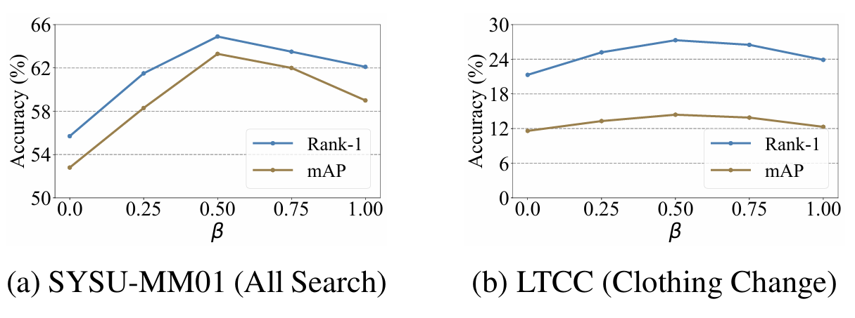 我们在常用的SYSU-MM01(Wu et al. 2017)、LTCC(Qian et al. 2020)和MLR-CUHK03(Pang, Zhao, and Wang 2024b)上评估所提出的方法,使用平均精度均值(mAP)和累积匹配特性(CMC)作为评估指标。补充材料中包含数据集和实现细节。