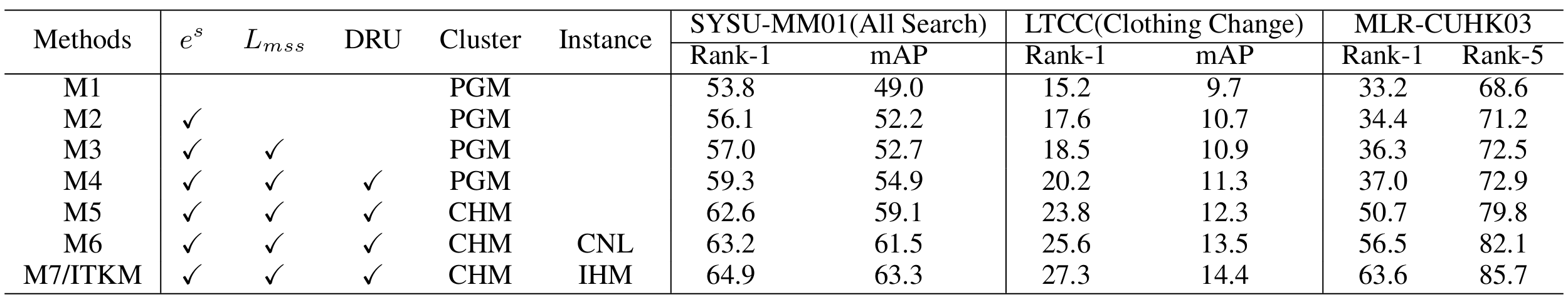 在表1中,我们分别评估了在单个场景下训练的ITKM(记为ITKM(S))和在三个场景上联合训练的ITKM(记为ITKM(M))在SYSU-MM01、LTCC和MLR-CUHK03上的性能。