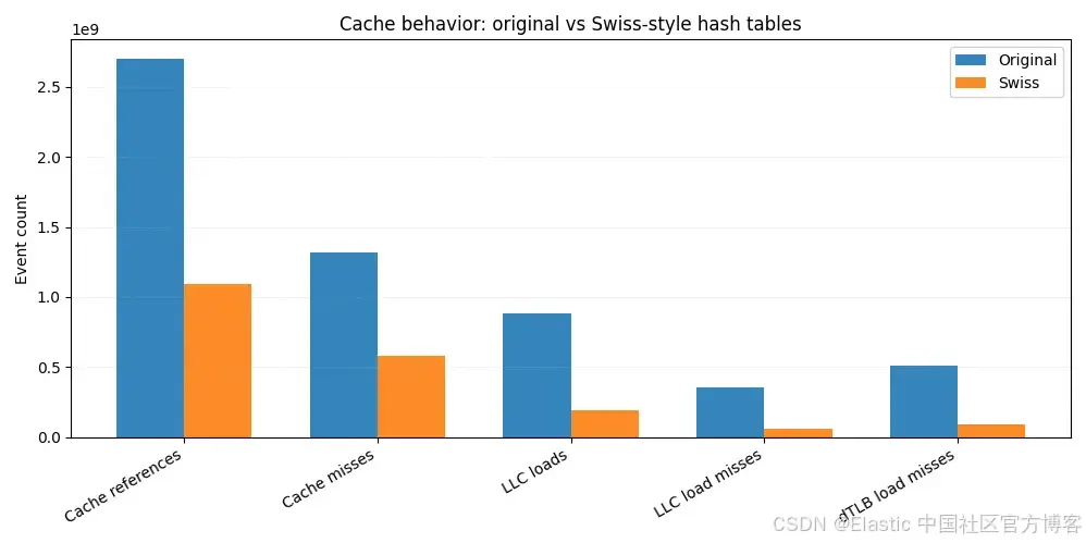 与原实现相比,瑞士版本总体缓存引用减少约 60%。最后一级缓存(LLC)加载下降超过 4 倍,LLC 加载未命中下降超过 6 倍。由于 LLC 未命中通常直接转化为主内存访问,仅这一减少就解释了端到端性能提升的大部分。