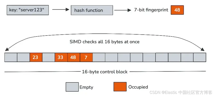 每个控制 byte 表示一个 slot,在我们的例子中编码两件事:该 slot 是否为空,以及从 hash 派生的短 fingerprint。这些控制 bytes 在内存中连续排列,通常以 16 个为一组,非常适合单指令多数据 (SIMD) 处理。