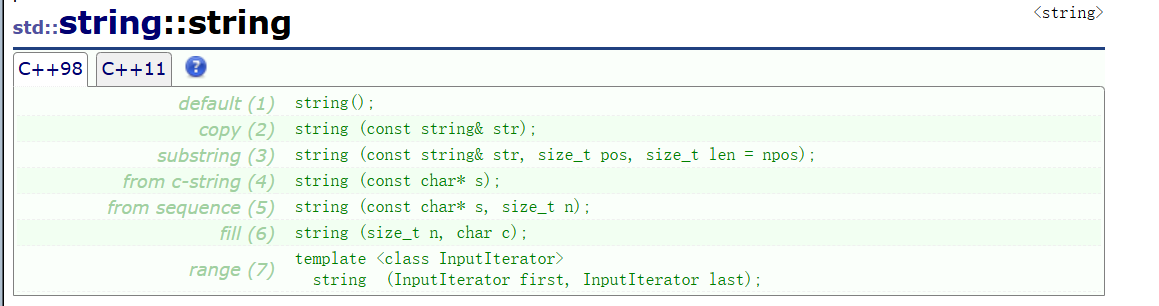 | string(size_t n, char c) | string类对象中包含n个字符c |