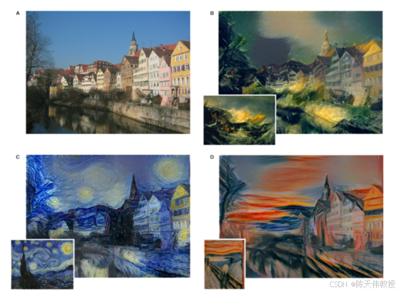 展示了通过这种方法生成的几幅作品。左上角的图像是原始图片(图宾根小城),而下方三幅则是经过风格迁移后的结果,每一幅都应用了不同的艺术风格。提供风格的三幅名画分别来自画家约瑟夫·特纳、文森特·梵高和爱德华·蒙克(每个子图的左下角)。可以看到,这种风格迁移技术确实能够生成大师风格的作品。