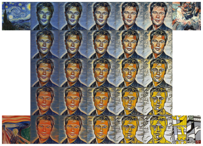 研究者们还对这种方法进行了改进,使得我们可以从多个风格图片中混合出一种独特的风格。如图 26.6所示,四个角上的四幅作品代表了四种不同的艺术风格,而中间的图片是将这些风格以不同比例混合后得到的效果。这一结果体现了风格迁移技术的灵活性和创新潜力。