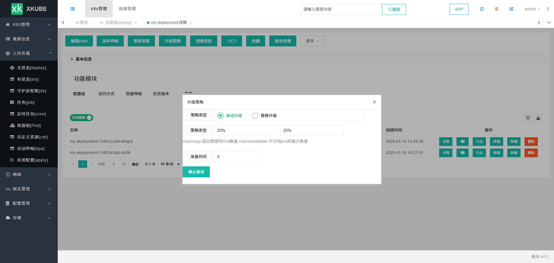 通过多集群k8s管理平台xkube的功能可以轻松的设置更新策略,xkube安装部署参考:https://blog.csdn.net/weixin_56364253/article/details/156390146