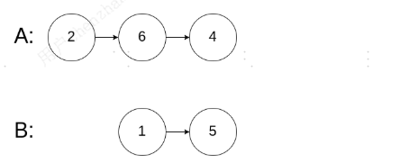 解释:从各自的表头开始算起,链表 A 为 [2,6,4],链表 B 为 [1,5]。