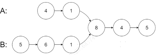 从各自的表头开始算起,链表 A 为 [4,1,8,4,5],链表 B 为 [5,6,1,8,4,5]。