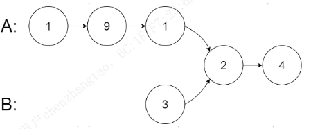从各自的表头开始算起,链表 A 为 [1,9,1,2,4],链表 B 为 [3,2,4]。