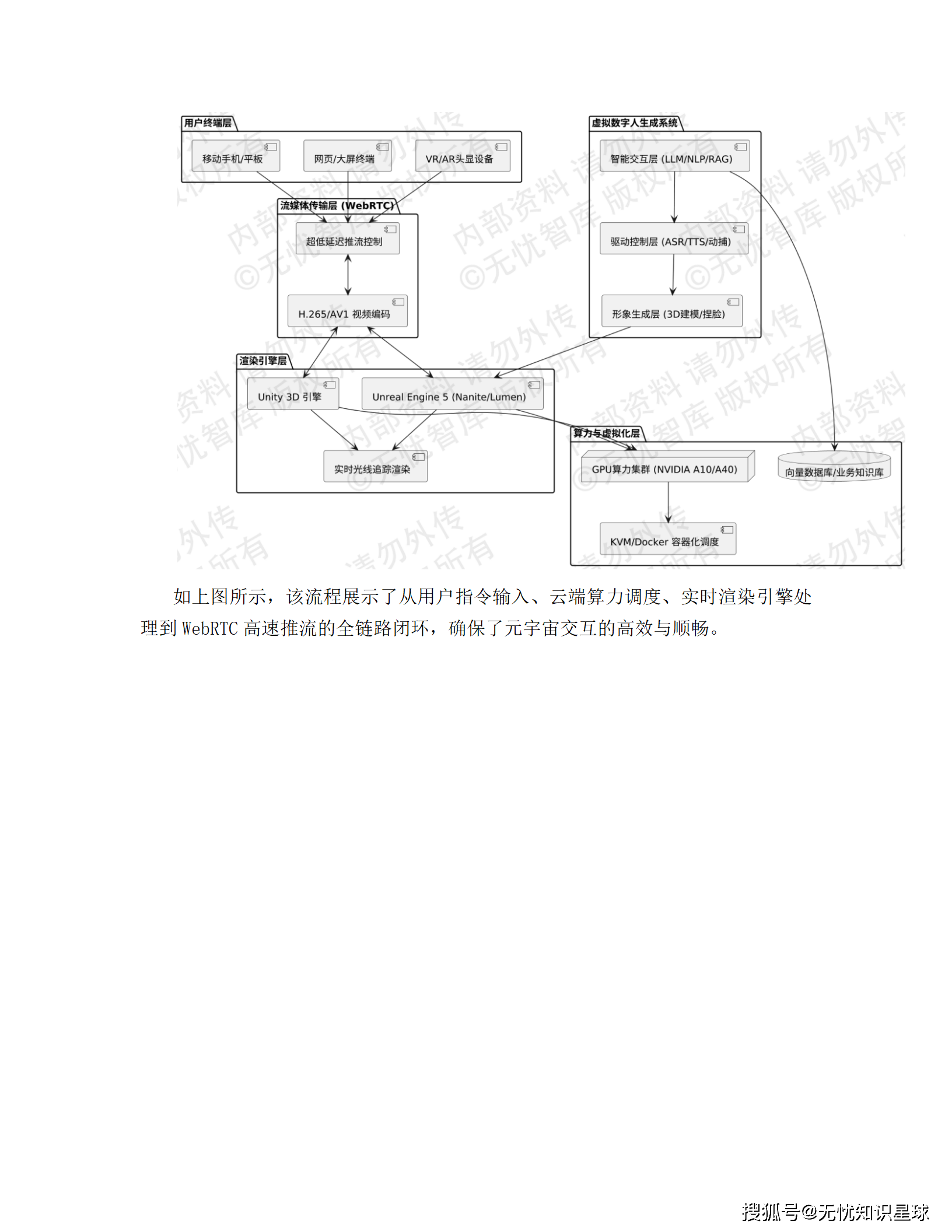 为解决高保真画质与终端性能限制的矛盾,方案构建了强大的云渲染平台 与虚拟数字人系统。