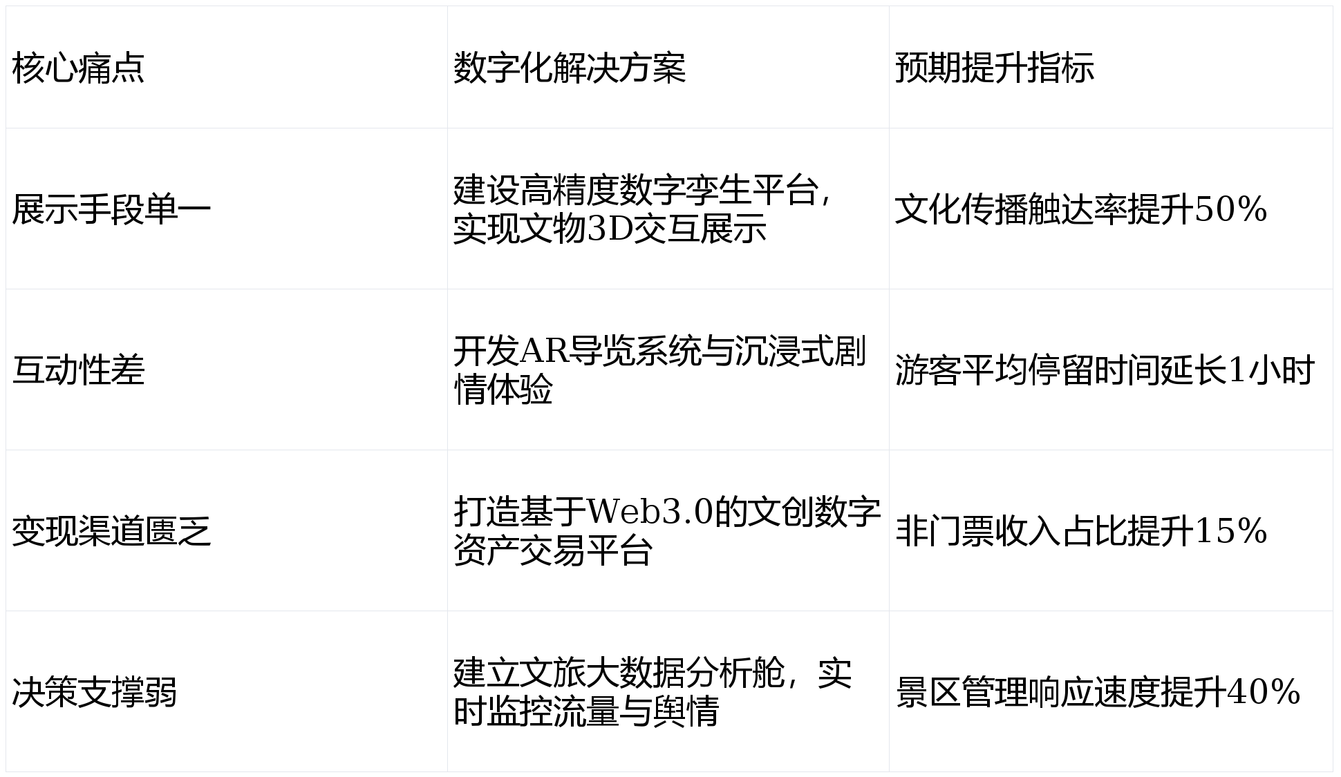 - 地方痛点:本市虽有丰富文化资源,但面临展示手段单一、互动性差、变现渠道匮乏、运营管理粗放等瓶颈,亟需通过数字化手段激活存量资产。