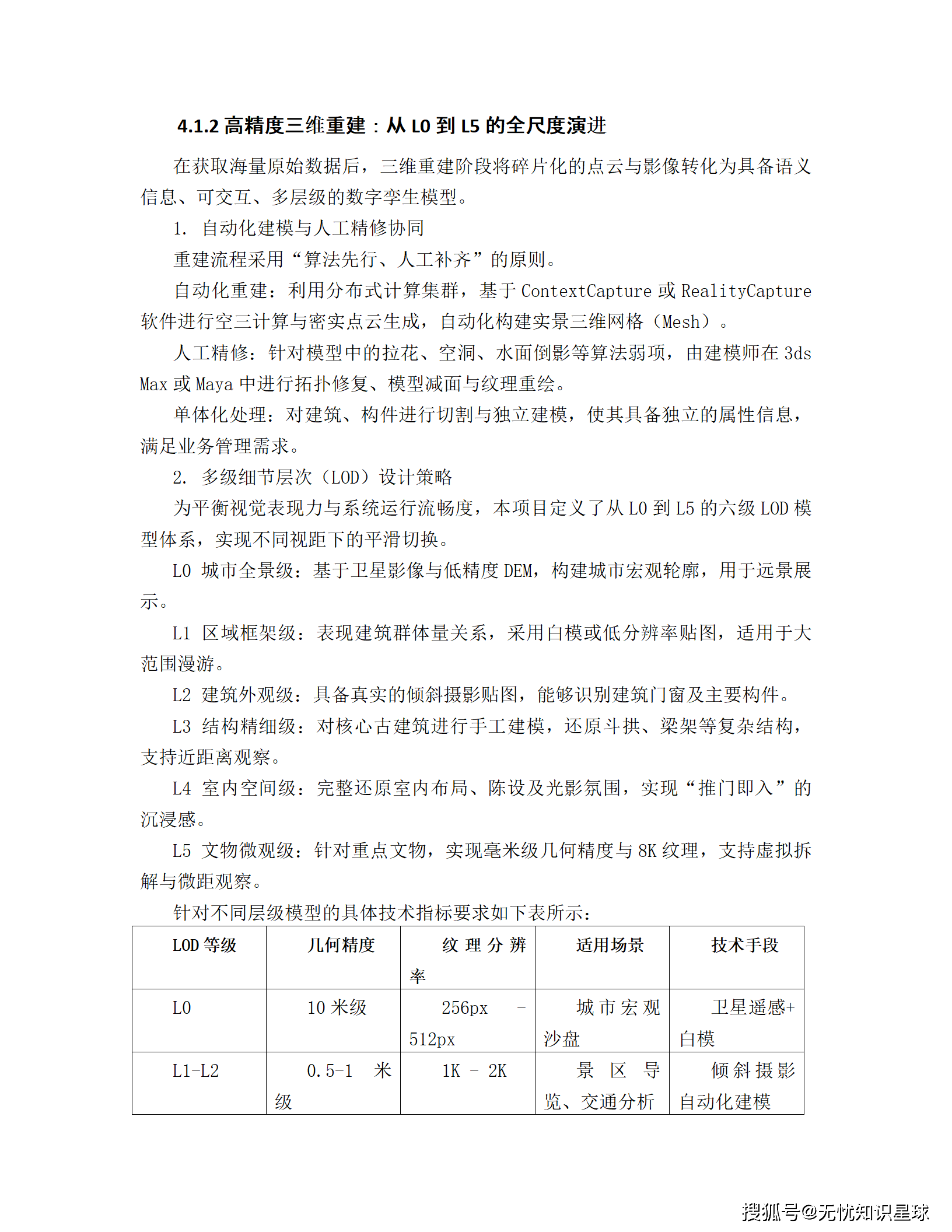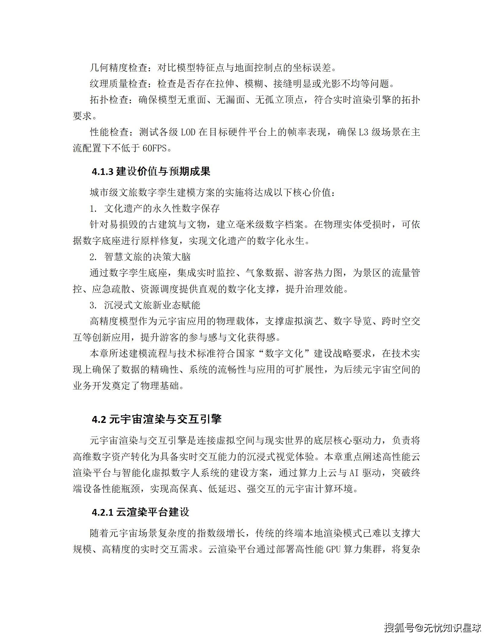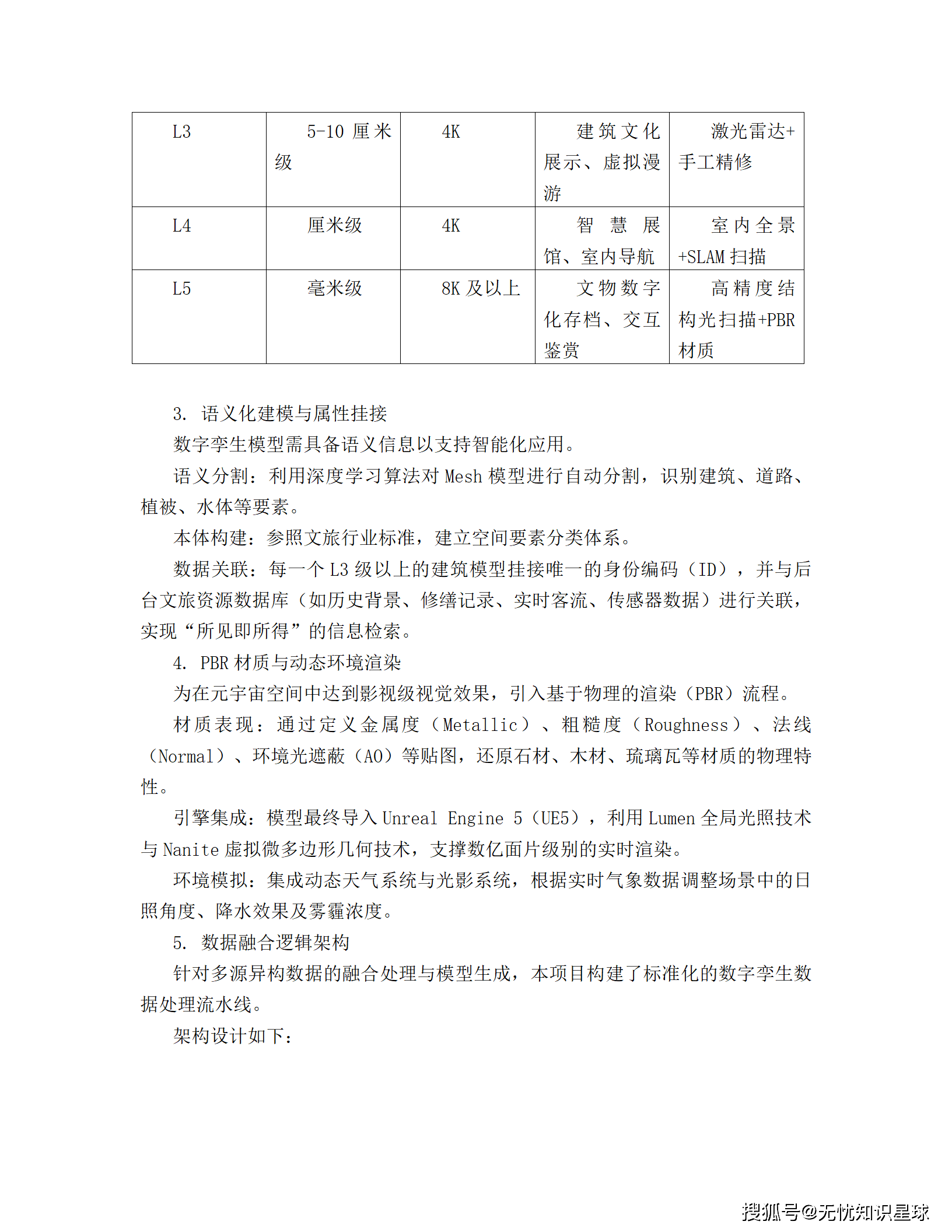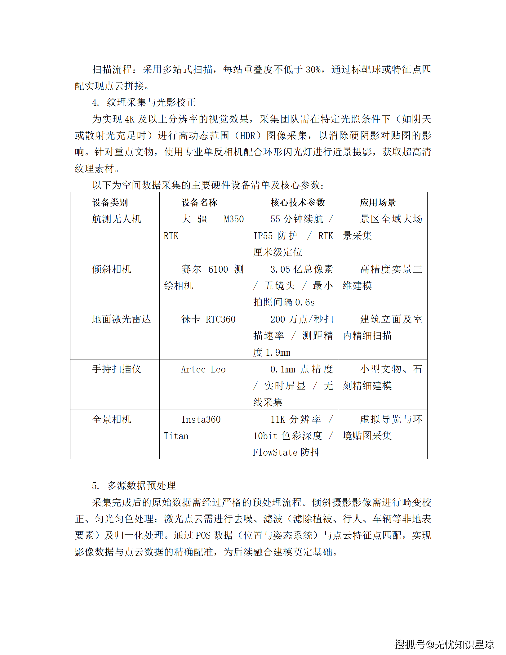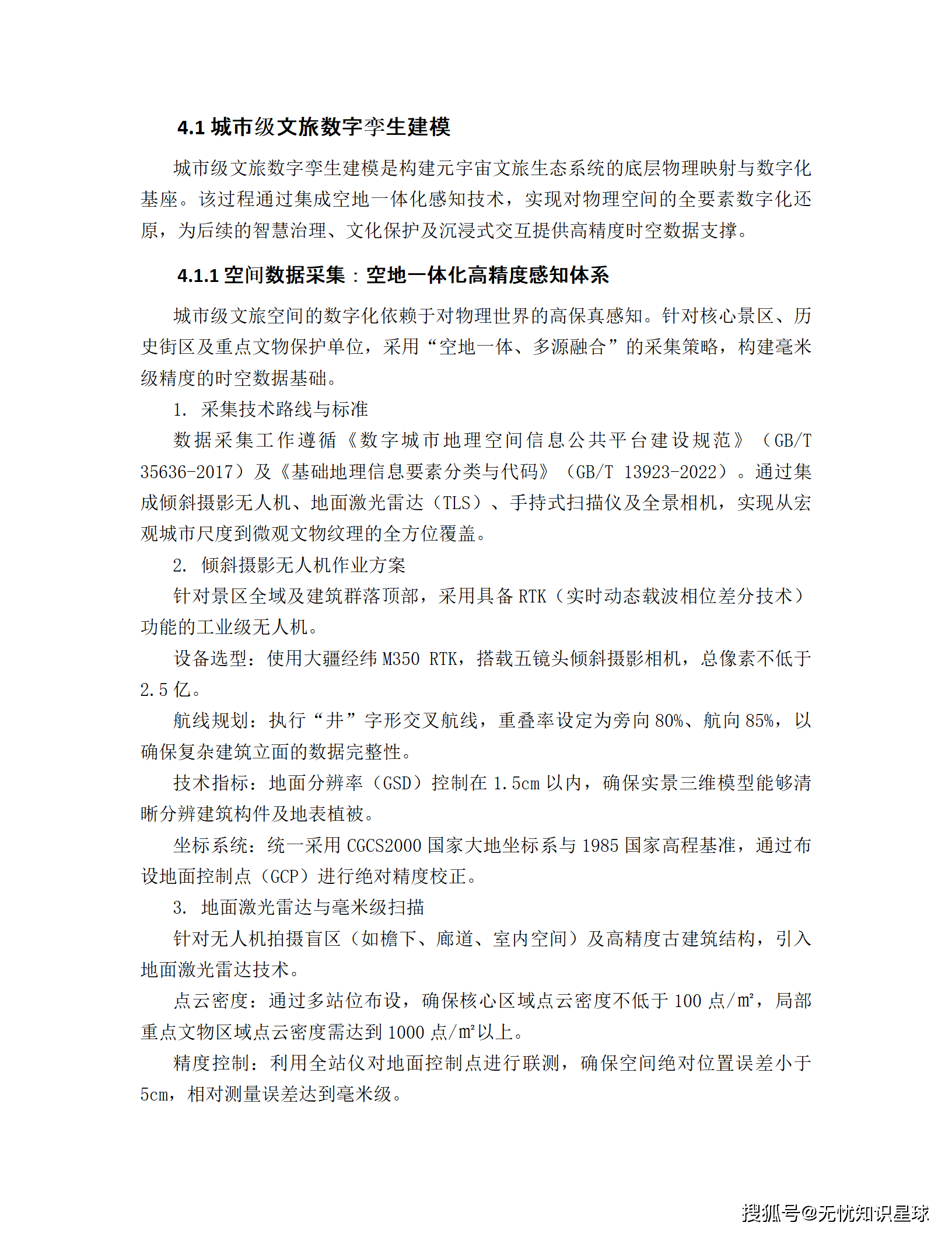 - 空间数据采集 :空中 :采用具备RTK功能的工业级无人机进行倾斜摄影,地面分辨率(GSD)控制在1.5cm以内。地面:引入地面激光雷达(TLS)和手持式扫描仪,对无人机拍摄盲区及高精度古建筑结构进行毫米级扫描。