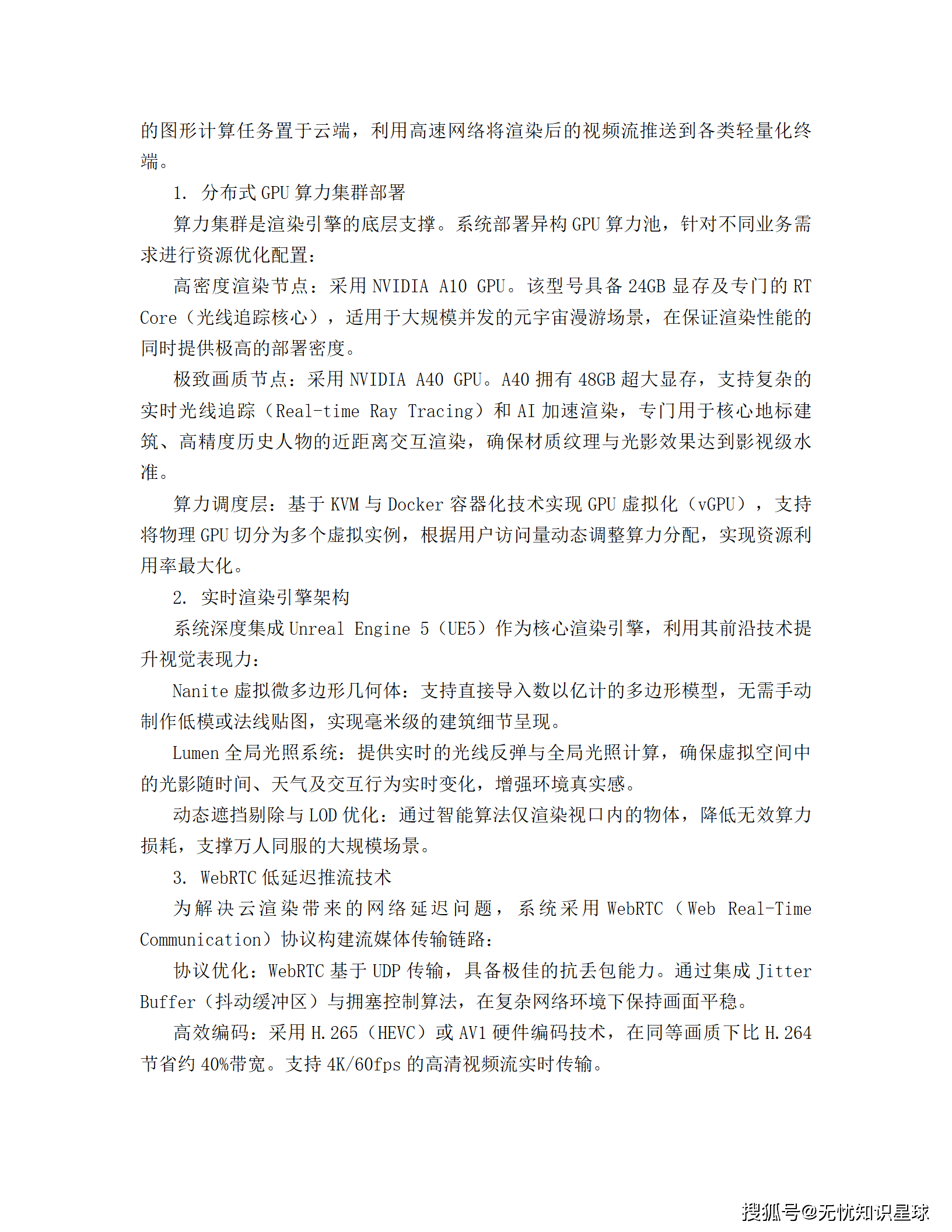 - 云渲染平台 :算力集群 :部署异构GPU算力池,NVIDIA A10用于高密度并发渲染,NVIDIA A40用于极致画质渲染。实时渲染 :深度集成UE5,利用Nanite和Lumen技术,支撑数亿面片级别的实时渲染。低延迟推流:采用WebRTC协议,通过H.265/AV1硬件编码,将端到端延迟严格控制在50ms以内。