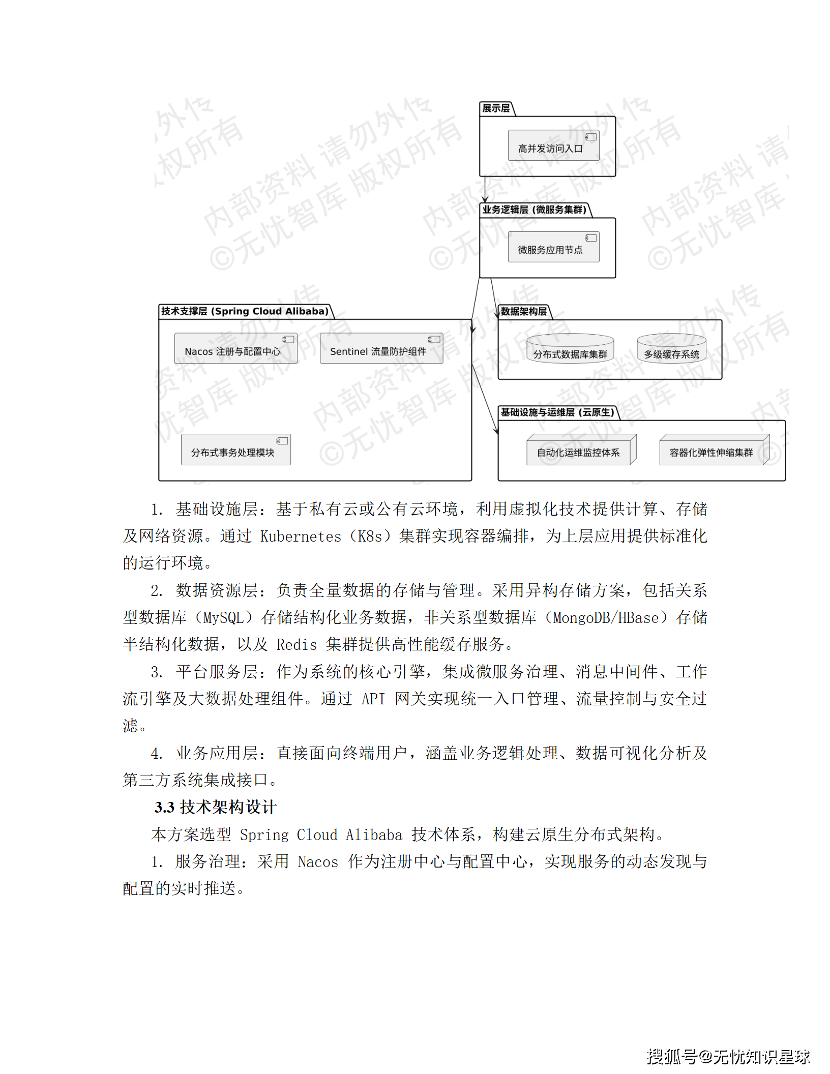 - 平台服务层(PaaS):作为系统核心引擎,集成微服务治理、消息中间件、工作流引擎及大数据处理组件。