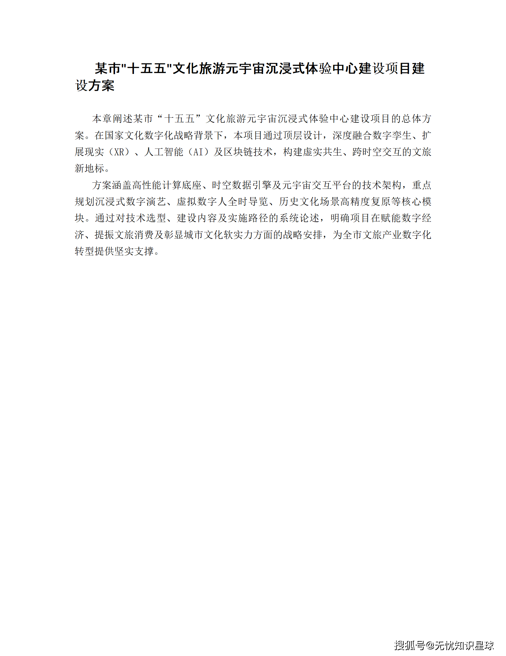 这份《某市"十五五"文化旅游元宇宙沉浸式体验中心建设项目》方案,不仅是一份技术文档,更是一份面向未来的文旅宣言。它清晰地描绘了如何通过前沿技术,将沉睡的文化资源转化为可感知、可互动、可共鸣的鲜活体验。