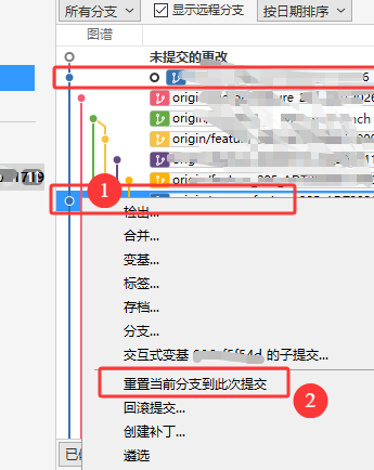 找到当前分支提交前的上一个远程节点,右击,重置当前分支到此提交。