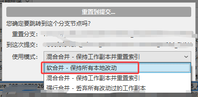 选择软合并,保持所有本地改动,就回滚到提交前了(这里要注意,回滚到提交前,就是提交信息也会消失了。并且一定要软合并,简单的事情简单做)