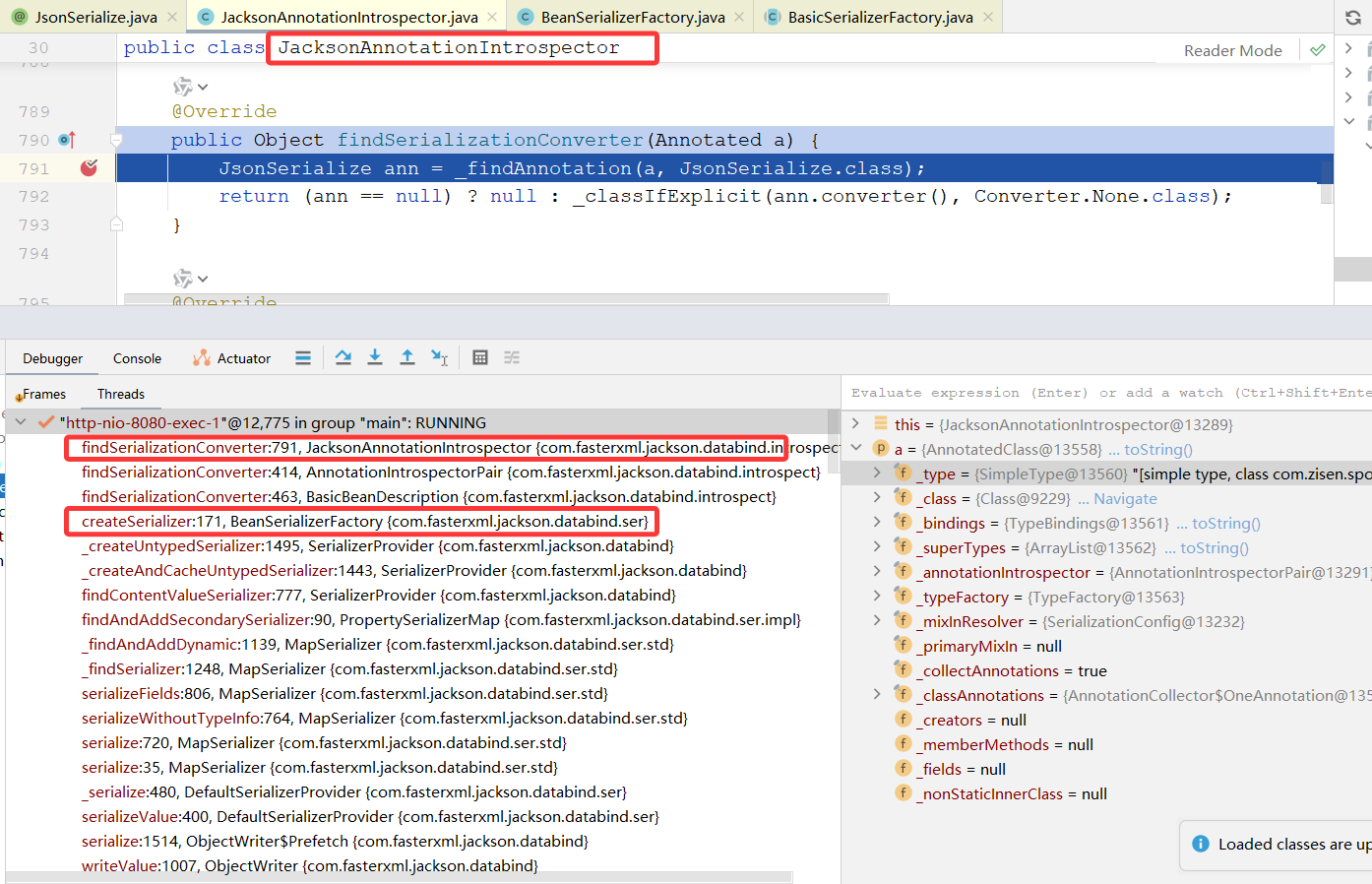 在创建某个数据的序列化对象时,会调用 JacksonAnnotationIntrospector.findSerializationConverter() 方法,判断对应属性或类是否添加了 @JsonSerialize 注解。