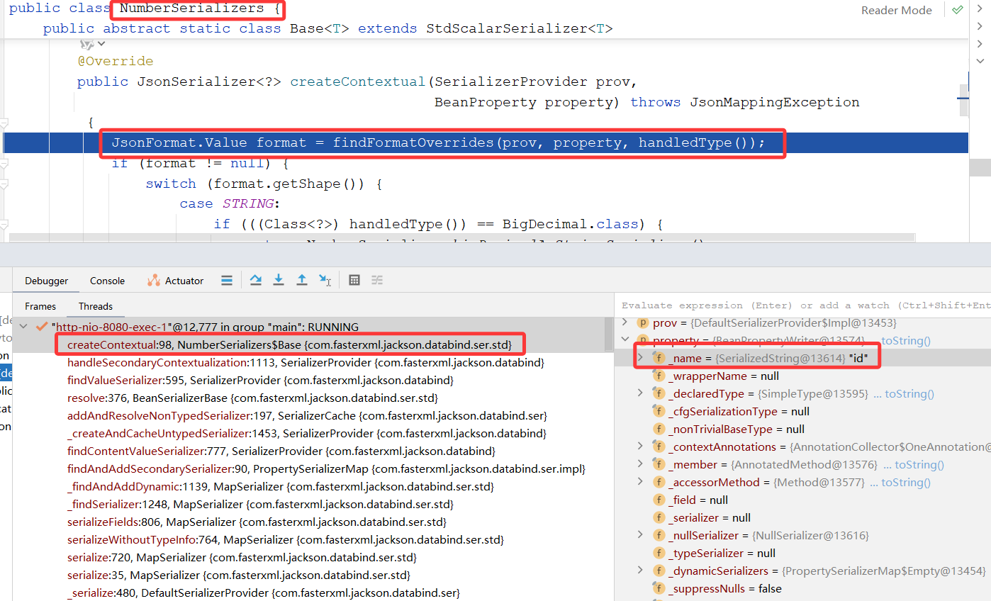 不同类型的属性在 BeanPropertyWriter 对象中,关联一个对应的 _serializer ,如果是数字的属性,如 Integer、Long 等,为 NumberSerializers。执行 serializer 的 createContextual() 方法。