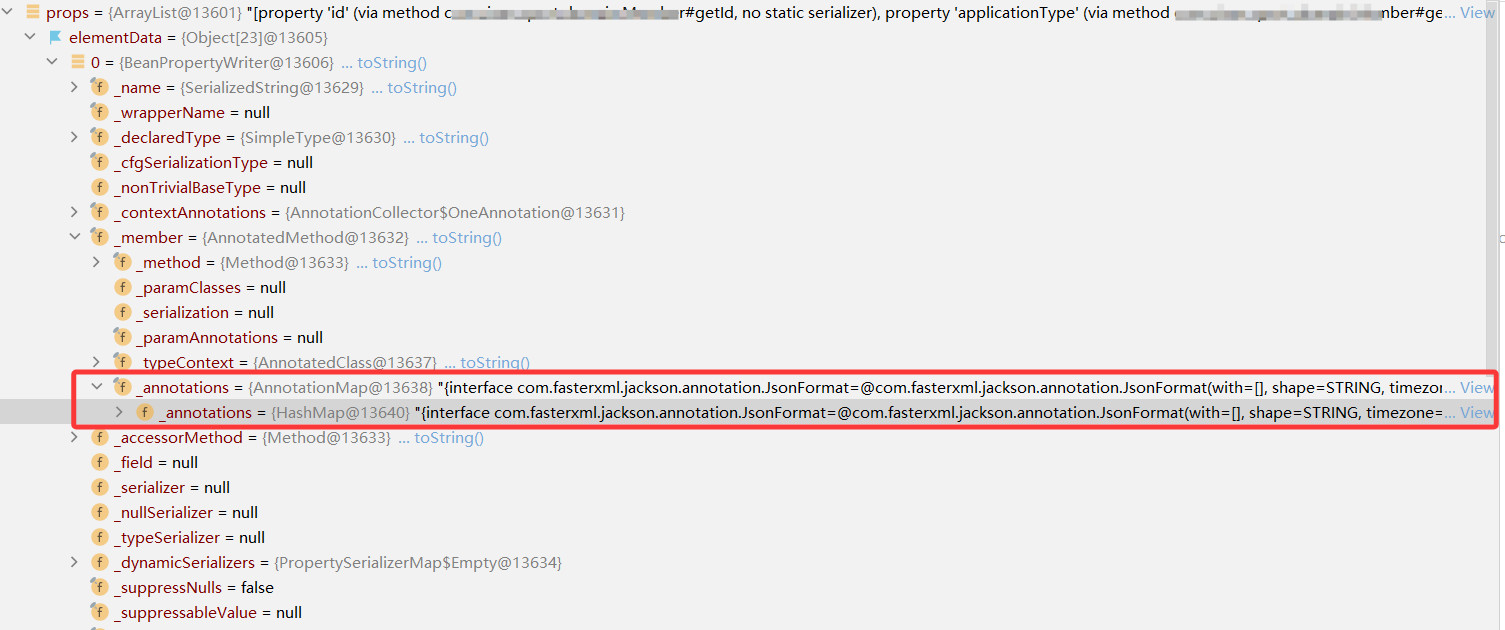 Java 对象解析后的每个属性对应的 BeanPropertyWriter 对象中的 _annotations 会记录该属性添加的注解。