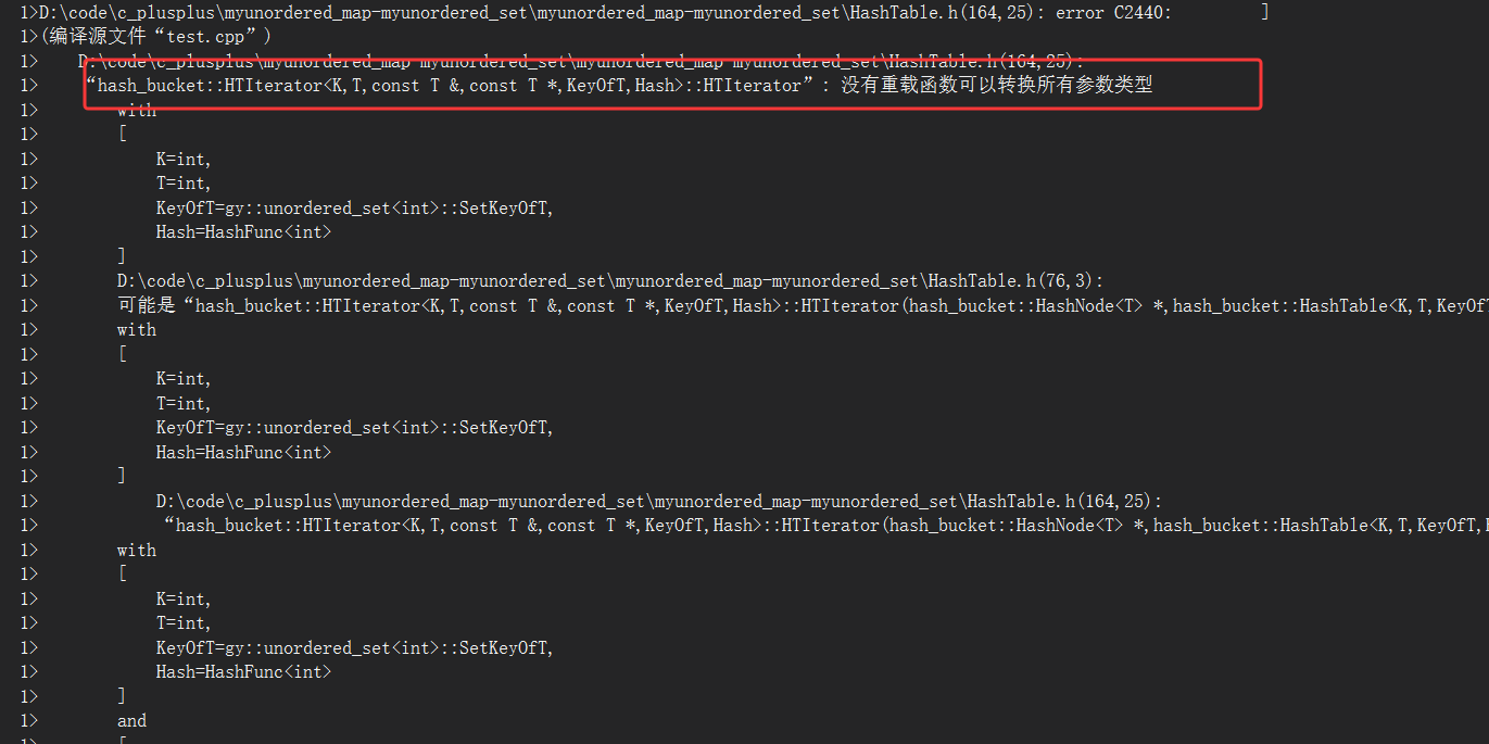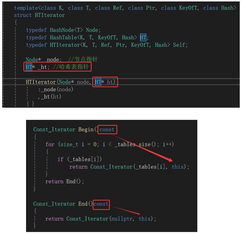 - 原因以及解决办法:迭代器初始化时传入的哈希表指针是HT*类型,但是const_iterator迭代器是被const修饰的(修饰的就是哈希表指针),const修饰的变量传给普通变量权限放大,因此编译无法通过。