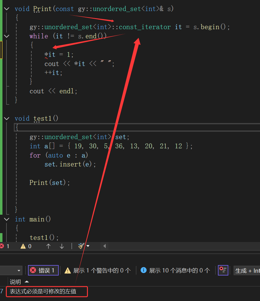 - 问题:上述代码编译报错,显示const迭代器没有重载函数可以转换的所有参数类型