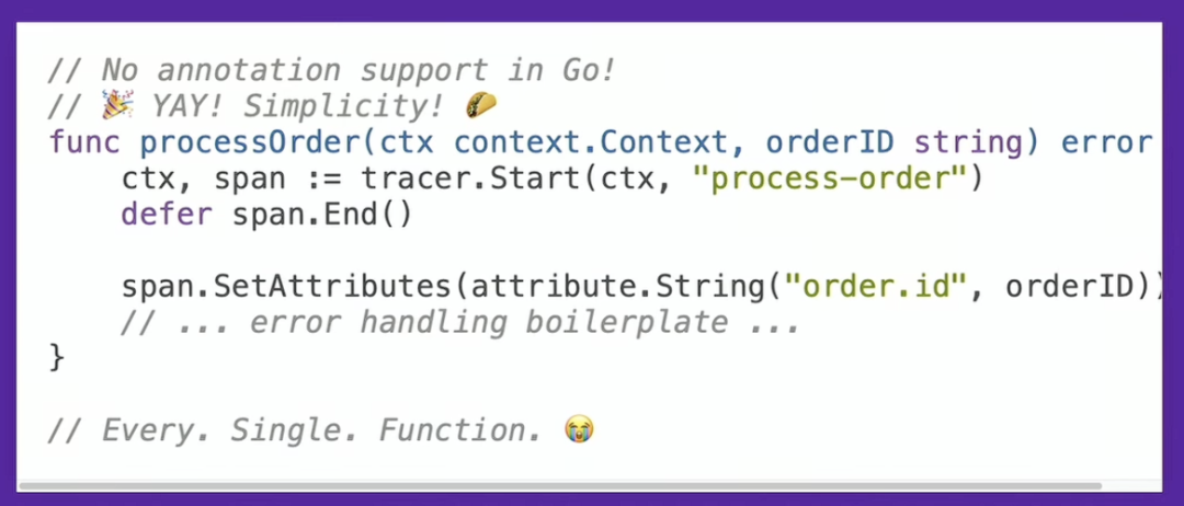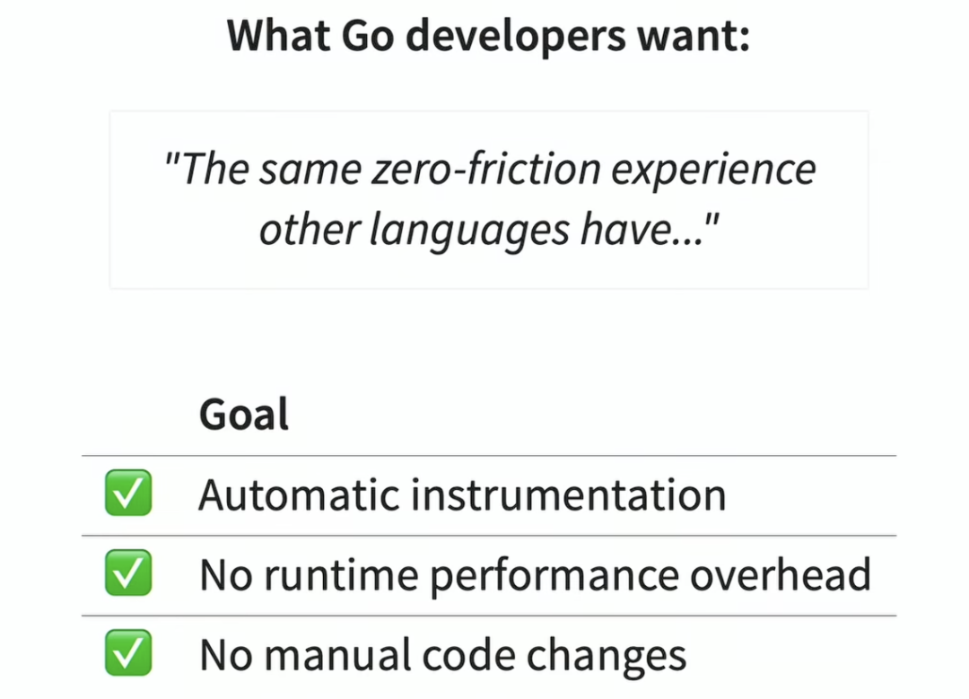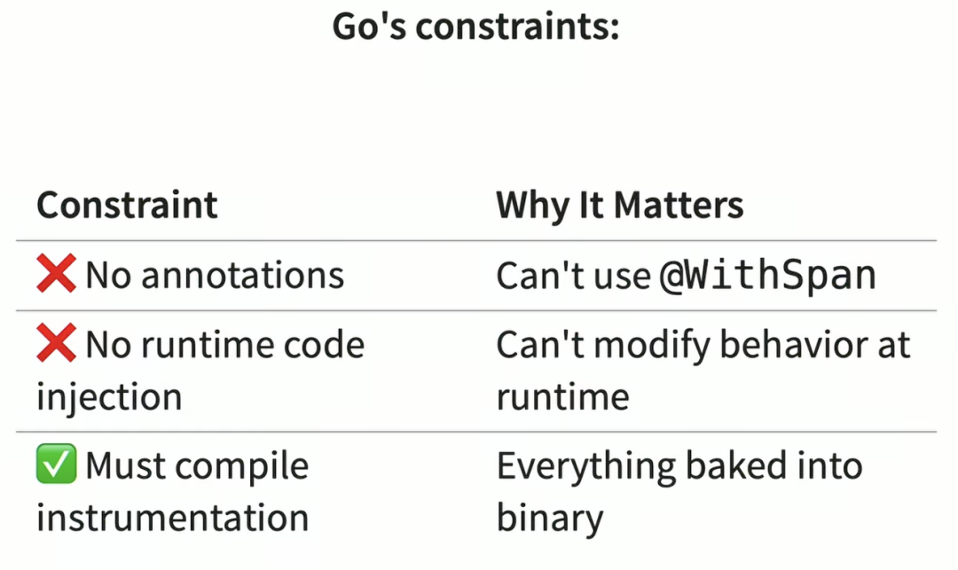 相比之下,Java 和 Python 开发者享受着"零代码修改"的自动插桩福利。Go 开发者能否拥有同样的体验?