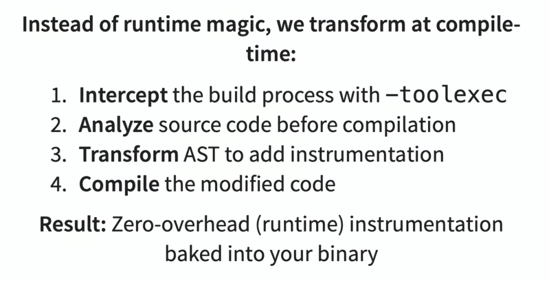 Kemal 及其团队发现,Go 虽然没有运行时魔法,但在**编译时** 却留了一扇窗:-toolexec 标志。