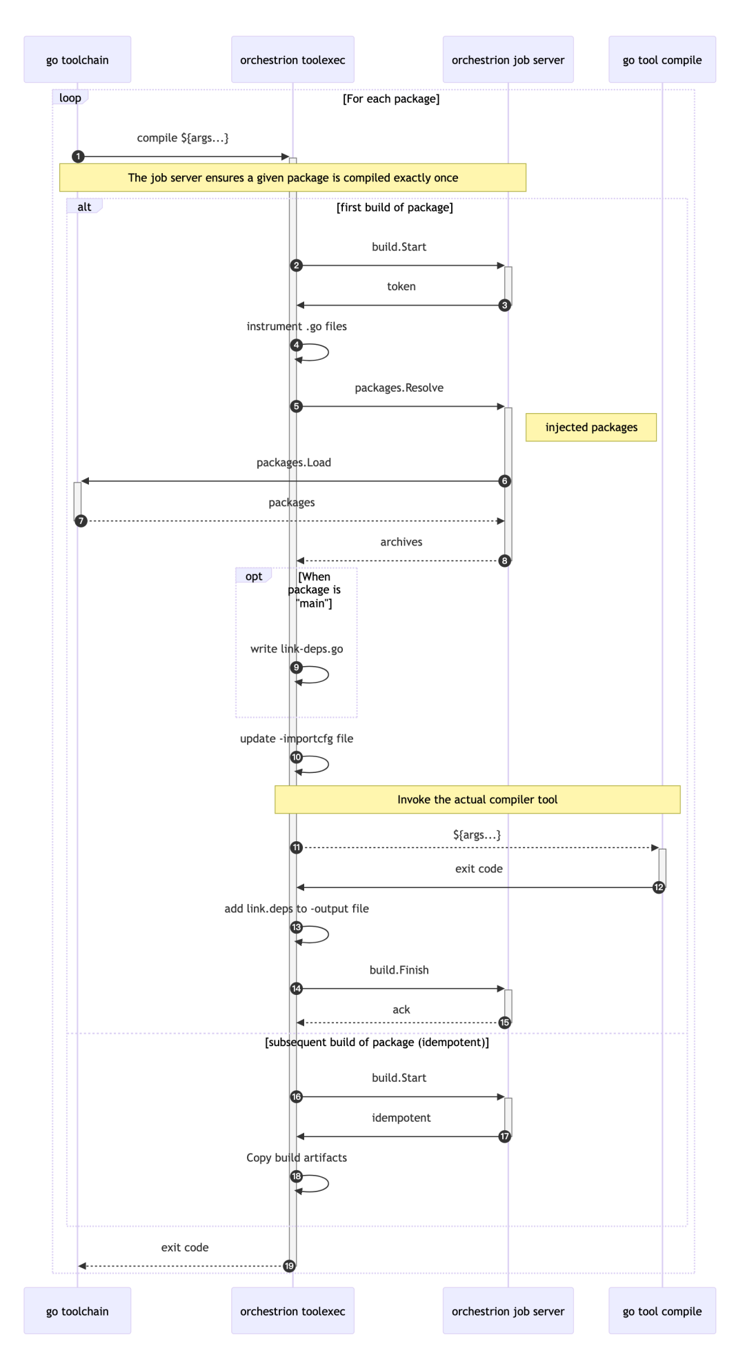 go build启动时,Orchestrion 守在门口。它并不关心链接器(linker)或汇编器(asm),它的目光紧紧锁定在compile命令上。每当 Go 编译器准备编译一个包(Package),Orchestrion 就会叫停。 -