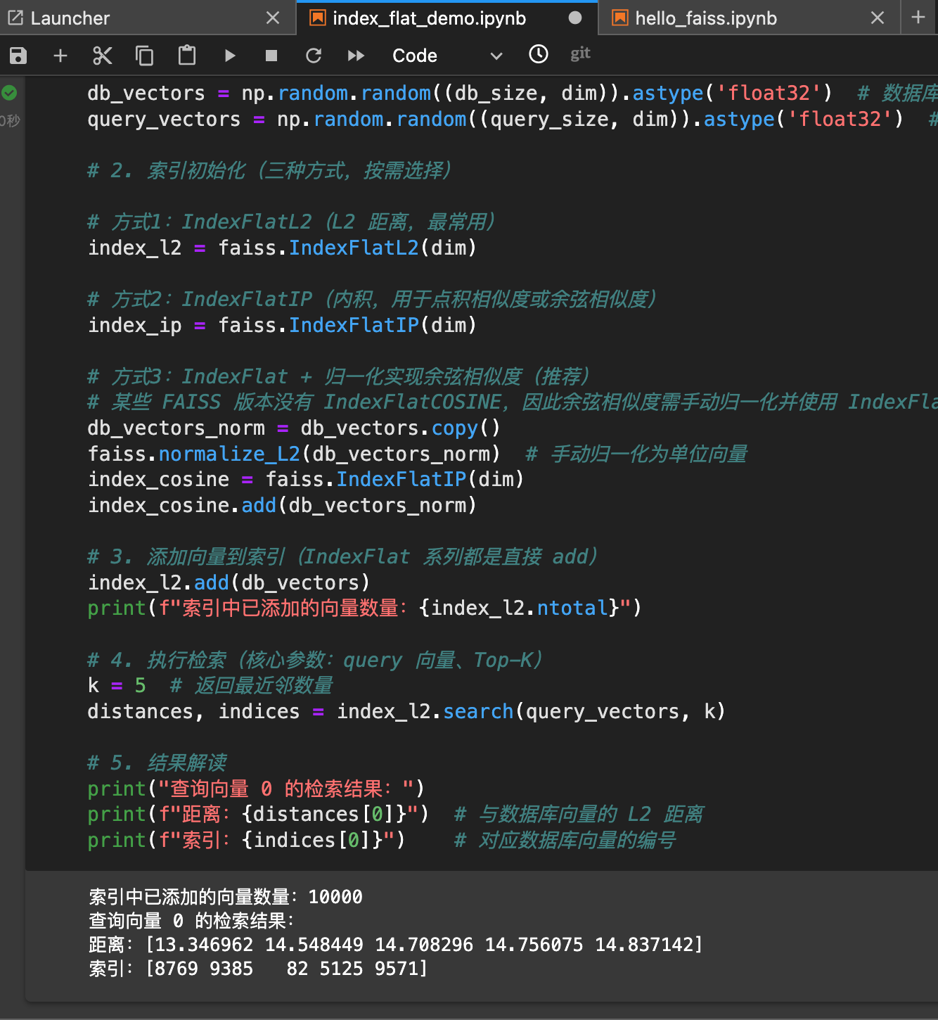 - GPU加速:对于超大规模数据(千万级以上),使用GPU版本Faiss可将查询速度提升10-100倍,核心代码只需修改索引初始化。