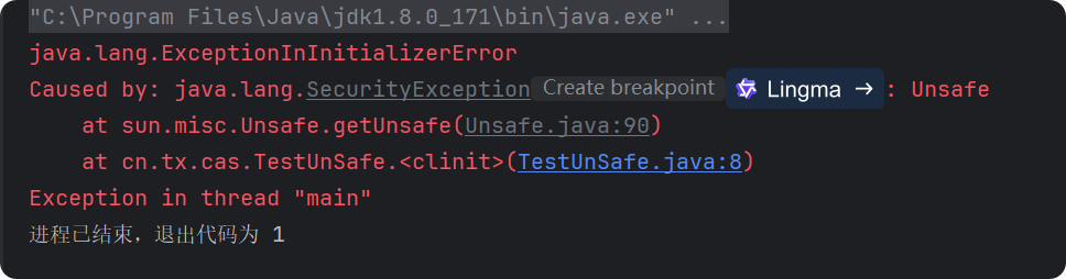 你在类加载阶段就执行了Unsafe.getUnsafe(),这段代码报错的核心原因是 Unsafe.getUnsafe() 存在严格的访问权限限制,JVM 不允许普通应用类直接调用这个方法。只有由 ** 引导类加载器(Bootstrap ClassLoader)** 加载的类(比如 JDK 核心类库),才能直接调用该方法。你的TestUnSafe类是由 ** 应用类加载器(App ClassLoader)** 加载的,所以调用Unsafe.getUnsafe()会触发SecurityException,导致静态初始化失败(ExceptionInInitializerError)。
