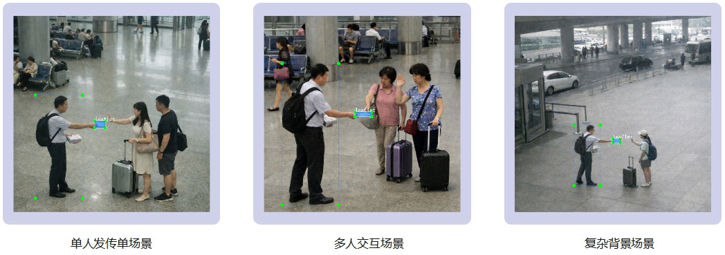 本数据集来源于真实公共空间的现场采集图像,覆盖人员与传单的 多样化出现形态。场景包含公共通行区域(如机场区域等) 的人群交互情形,具有不同光照、背景复杂度与遮挡程度,以增强模型 对实际部署环境的泛化能力。