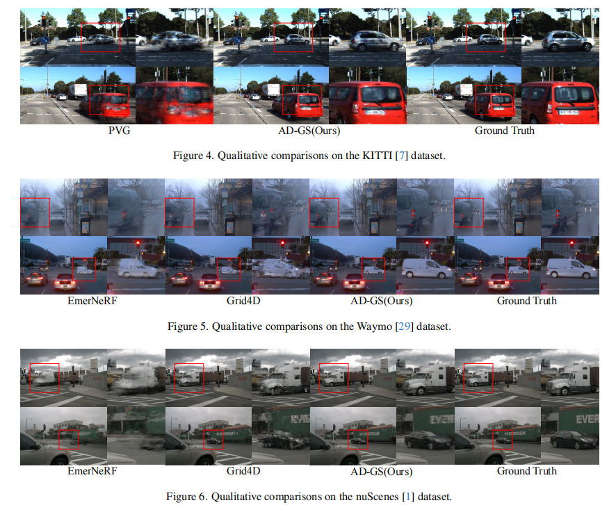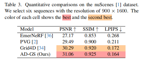 nuScenes 数据集(表 3):AD-GS 以 PSNR=31.06、SSIM=0.925、LPIPS=0.164 位居榜首,优于 Grid4D(PSNR=30.29)。