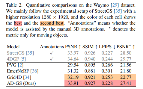 Waymo 数据集(表 2):AD-GS 的 PSNR=33.91,接近人工辅助模型 StreetGS(33.97),移动目标 PSNR∗=27.41,远超 PVG(21.56);