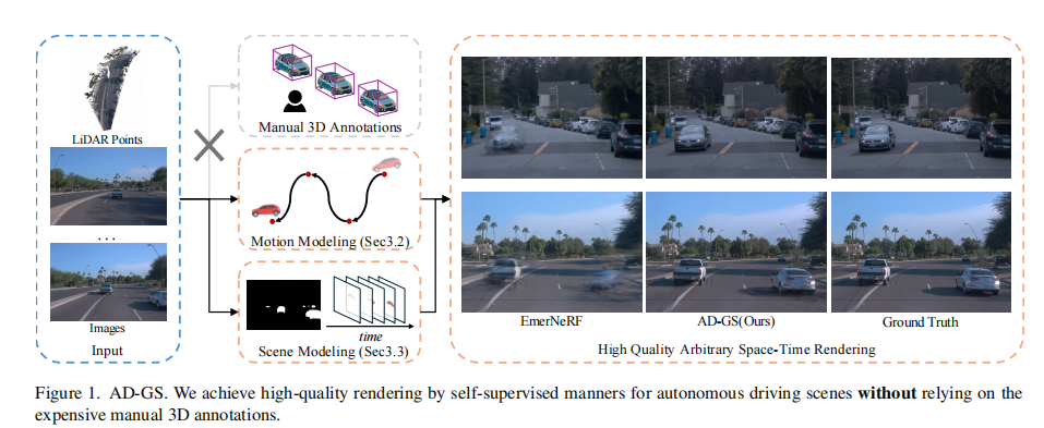 AD-GS 的创新点主要体现在三个关键方面,构建了一套完整的自监督自动驾驶场景渲染解决方案: