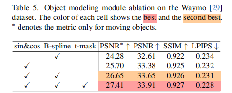 - 添加目标和天空掩码损失(obj&sky):PSNR 提升至 26.98,场景分解更清晰;
