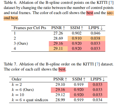 B 样条参数消融:当控制点数量为总帧数的 1/3、阶数 k=6 时性能最优(表 6、表 7),过疏或过密的控制点、过低或过高的阶数都会导致局部拟合能力下降或平滑性不足;