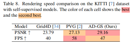 渲染速度:AD-GS 在 KITTI 数据集上达到 47 FPS,虽低于 PVG(58 FPS),但显著优于 Grid4D(40 FPS),在保持高渲染质量的同时兼顾实时性(表 8)。