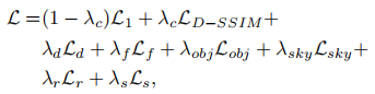 - 超参数设置:λc=0.2,λd=0.1,λf=0.1,λobj=0.1,λsky=0.05,λr=0.5,λs=0.01;