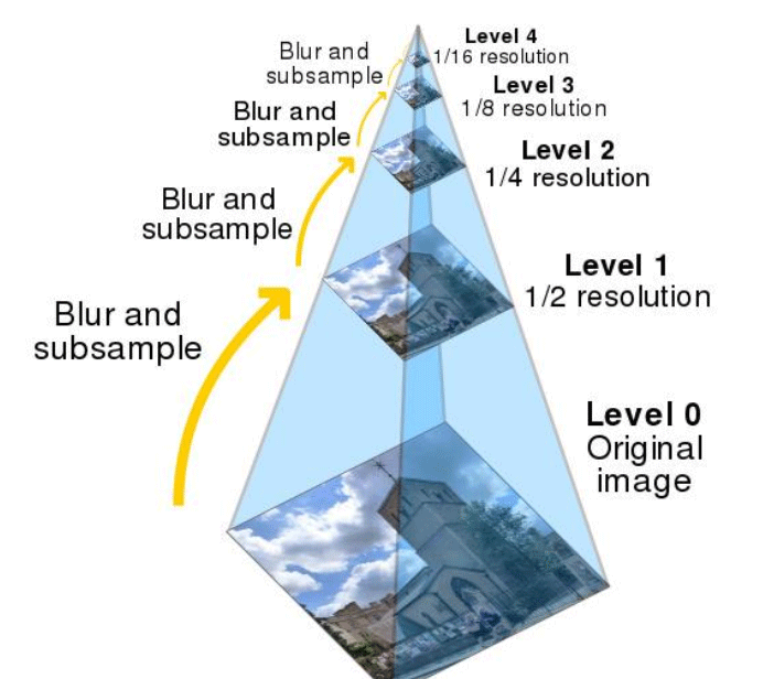 - 高斯金字塔越往上,图像越小、分辨率越低;