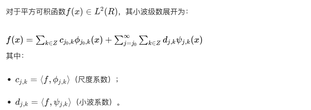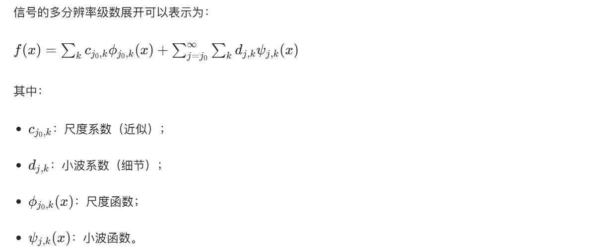 - 核心概念:多分辨率分析的本质是"分而治之",用尺度函数描述低频近似,小波函数描述高频细节;