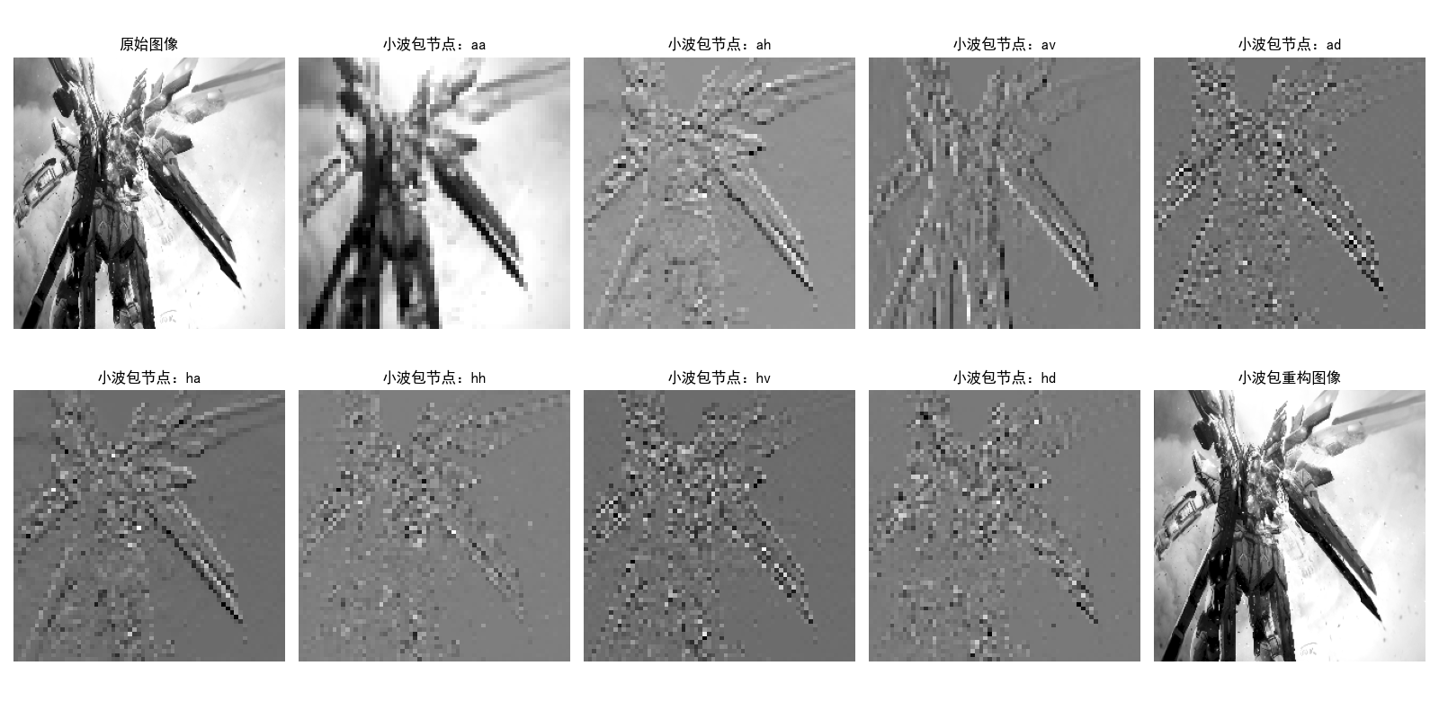 pywt.WaveletPacket2D():二维小波包分解,支持多级别、全子带分解;get_level():获取指定级别的所有小波包节点;- 小波包的每个节点对应一个频率子带,能更精细地刻画图像的频率特征;