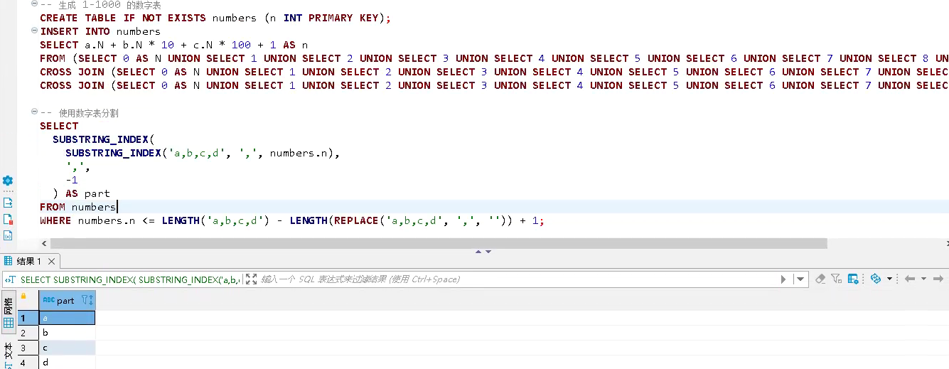 Spark SQL、PostgreSQL最方便,思路也比较相似,都是先将字符串拆分数组,然后扩展成表。SQLServer新版本实现较为方法,直接一个函数搞定。Oracle利用其connect by来实现,也相对便捷,只是相对主流SQL方言比较小众一点。Mysql新版本相对方便一点,老版本需要辅助表增加维护成本。