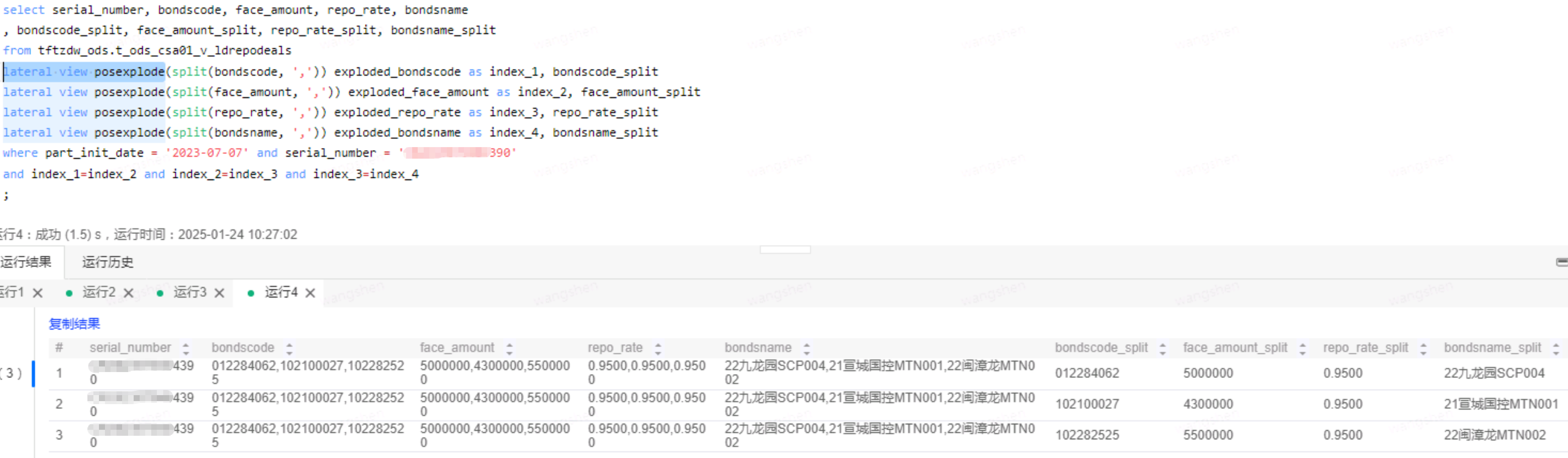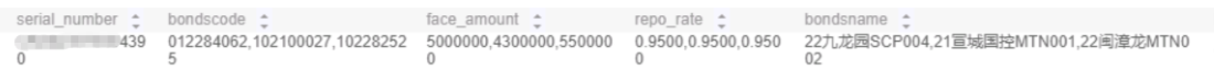 除此之外,在一些特定的业务场景中,如证券场景中,需要将一笔回购合约涉及到的多个质押券进行拆分(提取每个质押券有质押数量及对应标准券转换比例),数据示例如下: