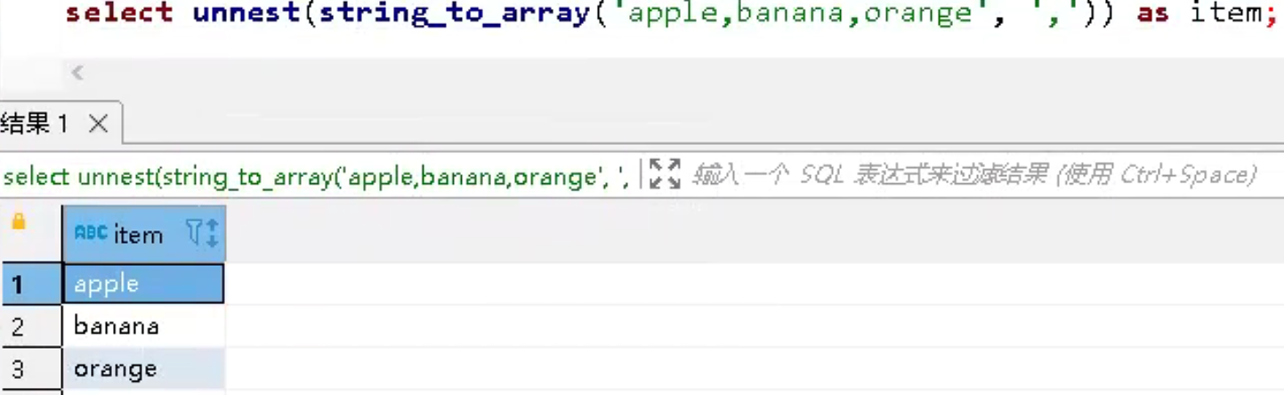方法一:首先利用string_to_array将字符串切割成数组,然后利用unnest将数组扩展成表