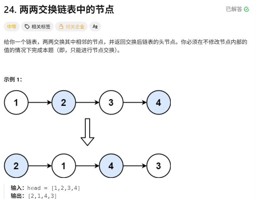 心得:我原本想的思路是创建一个新的链表,先指向所有偶次链表节点,然后插入所有奇数链表节点,但是实现起来琐碎且复杂。答案采用直接dummy链接整个head链表,再内部调整两个节点的顺序,代码超级简单,记住这种思路。