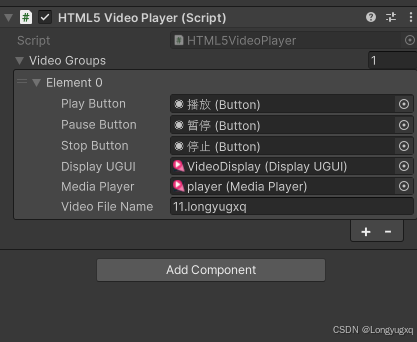 5.新建gameobject,添加HTML5VideoPlayer组件,并设置如下,videofilename的名称就是你的视频名称,视频位置webgl网页端主要是放在StreamingAssets中,视频的后缀名可以改为我这个名称。然后你同步设置也要同名称。