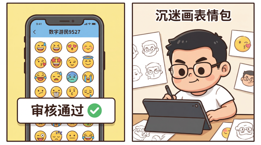 最近沉迷画表情包,今天又审核通过一组给「数字游民9527」这个账号定制的专属表情包。