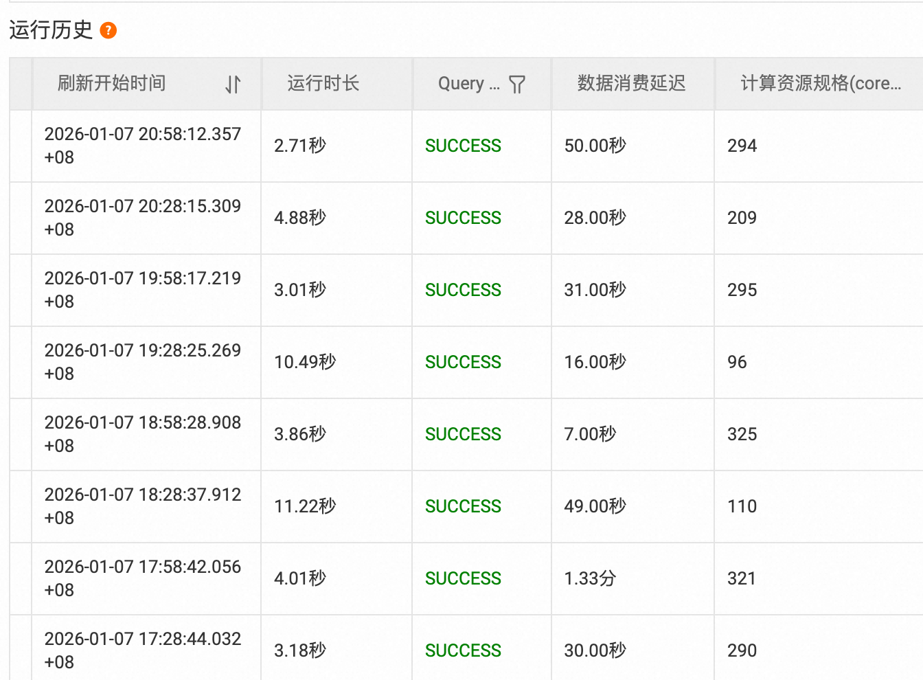 增量刷新策略: 采用动态表增量刷新 机制,设置分钟级 刷新间隔,实现近实时数据更新,并分钟级保存历史数据。