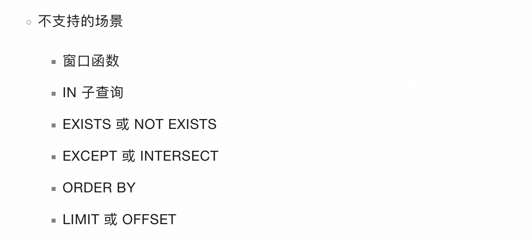 | IN子查询 | ❌ 不支持 | ✅ 支持 |