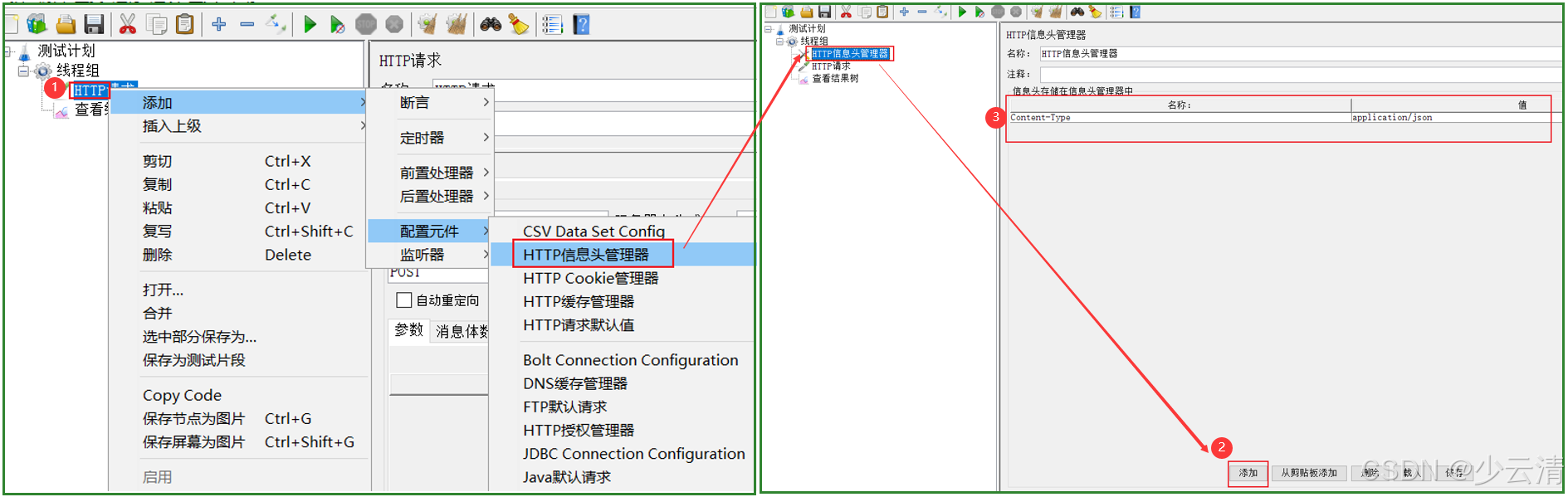 必须给"线程组" 添加 "HTTP信息头管理器"