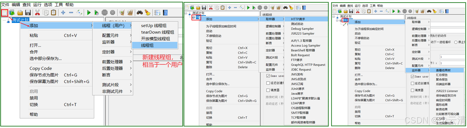 - 取样器(请求) 和逻辑控制器必须依赖线程组才能使用